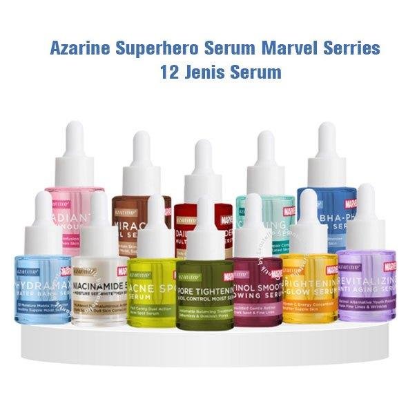 Azarine x Marvel Serum100% ORIGINALBPOMIsi 20ml?Acne Spot1. Merawat kulit berjerawat2. Mengatasi bruntusan3. Mengandung anti bakteri4. Mengontrol sebum berlebih?Retinol Smooth Glowing1. Mengurangi garis halus & kerut2. Menstimulasi produksi kolagen kulit3. Mempercepat proses pergantian sel 4. Mencerahkan kulit5. Merapatkan pori agar tampak lebih kecil?Niacinamide 5% + Moisture Sepiwhite1. Mencerahkan & memudarkan flek hitam/ bekas jerawat2. Meratakan warna kulit3. Membantu mengontrol sebum berlebih4. Merawat skin barrier5. Mengurangi kemerahan pada wajah?Brightening C-Glow1. Mencerahkan & memudarkan flek hitam/ bekas jerawat2. Meratakan warna kulit agar glowing3. Mengurangi garis halus & kerut4. Mengandung antioksidan untuk menangkal radikal bebas5. Melembabkan & membuat kenyal?AHA-BHA-PHA Peeling1. Mengangkat sel kulit mati kulit2. Membantu proses pergantian sel kulit3. Mencerahkan kulit akibat flek/ bekas jerawat4. Merapatkan pori5. Memperbaiki tekstur kulit (bopeng/ bruntusan)?Pore Tightening & Oil Control Moist1. Mengontrol minyak berlebih pada kulit2. Merapatkan pori agar tampak kecil3. Mengandung anti bakteri4. Memberi efek matte di kulit setelah pemakaian 7 hari?Hydramax Water Bank1. Melembabkan & membuat kenyal2. Merawat skin barrier3. Memperbaiki skin barrier4. Melindungi skin barrier5. Mambuat kulit tampak glowing dan segar?Radiant Luminous1. Mencerahkan kulit kusam2. Meratakan warna kulit3. Mengandung antioksidan untuk menangkal radikal bebas4. Melembabkan & membuat kenyal?Revitalizing Anti Aging1. Mengurangi garis halus & kerut2. Memperlambat penuaan dini3. Merawat kulit berjerawat4. Mengencangkan kulit & membuat kenyal5. Anti-aging untuk kulit sensitive & ibu hamil?Daily Defender Multivitamin1. Melindungi skin barrier dari polusi dan sinar blue light2. Menutrisi dengan multivitamin untuk kebutuhan harian kulit3. Memperlambat penuaan dini4. Memperbaiki skin barrier yang rusak?Calming Skin Pair1. Mengurangi kemerahan/ iritasi wajah ( HYPOALLERGENIC tested)2. Memperbaiki skin barrier yang rusak3. Menyeimbangkan kadar bioma kulit yang sehat4. Mencerahkan wajah5. Menutrisi secara menyeluruh?Miracle Oil1. Mengurangi garis halus & kerut2. Memperlambat penuaan dini3. Menambah elastisitas kulit4. Merawat skin barrier5. Melembabkan & membuat kenyal