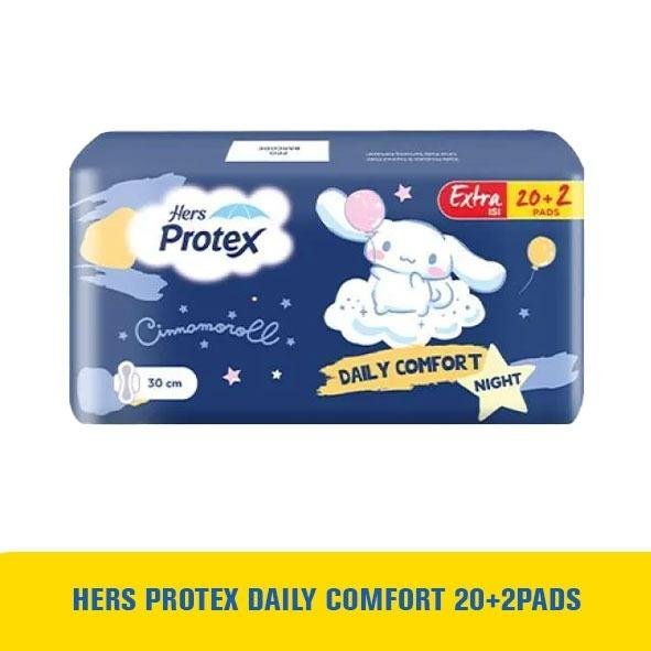 Detail produk: Hers Protex Daily Comfort . Pembalut siang dan malam dengan panjang dan bersayap memiliki pin hole area, soft edge dan easy open technology.