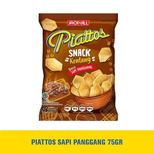 Piattos Snack Kentang adalah sebuah keripik kentang berbentuk unik. Terbuat dari kentang asli berkualitas, yang diolah secara higienis dan modern menggunakan teknologi tinggi. Kentang yang telah dicuci bersih dan dikupas di potong berbentuk segi 6 yang unik. Diiris tipis dan digoreng pada suhu yang tepat, sehingga menghasilkan kerikpik kentang berbentuk segi 6 dengan tekstur yang renyah. Dibalur dengan taburan perisa sapi panggang bubuk yang nikmat, memberikan rasa asin gurih yang nikmat pada keripik kentang. Dikemas dalam kemasan kantung ukuran 75 gram untuk menjaga rasa dan kualitas keripik. Cocok dijadikan cemilan saat sedang bersantai atau berkumpul bersama teman. Rasakan nikmatnya keripik kentang berbentuk unik pada Piattos Snack Kentang.