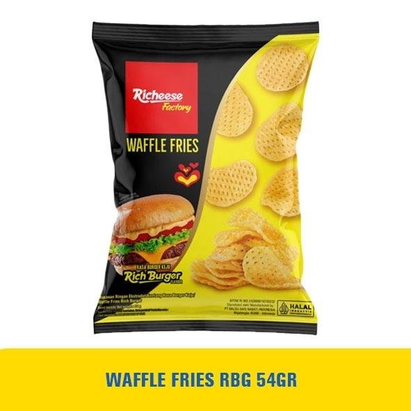 Nikmati kerenyahan lezat Richeese Factory Waffle Fries dalam kemasan 54g yang praktis. Tersedia dalam dua rasa yang menarik ? ayam pedas dan burger yang kaya rasa ? camilan ini cocok untuk segala acara.