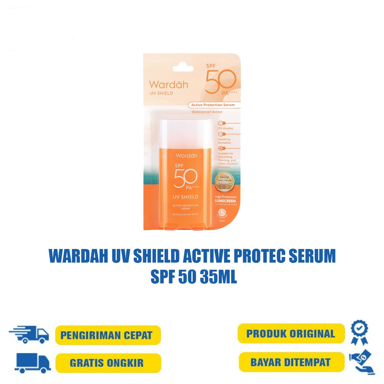 Wardah UV Shield Active Protection Serum, Sunscreen untuk perlindungan aktivitas di luar rumah seperti berenang, berjemur di pantai, liburan, dll. Penggunaan suncreen UV Shield membantu mengurangi kulit kusam dari paparan blue light, mencegah penuaan dini, menghindari munculnya bintik hitam di wajah, dan melindungi resiko kanker kulit. Sangat cocok digunakan untuk aktivitas dinamis di bawah paparan sinar matahari, seperti olahraga lari, berenang, berjemur di pantai, dll.