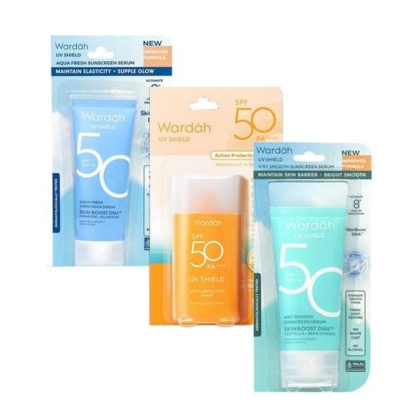Wardah UV Shield Active Protection Serum, Sunscreen untuk perlindungan aktivitas di luar rumah seperti berenang, berjemur di pantai, liburan, dll. Penggunaan suncreen UV Shield membantu mengurangi kulit kusam dari paparan blue light, mencegah penuaan dini, menghindari munculnya bintik hitam di wajah, dan melindungi resiko kanker kulit. Sangat cocok digunakan untuk aktivitas dinamis di bawah paparan sinar matahari, seperti olahraga lari, berenang, berjemur di pantai, dll.